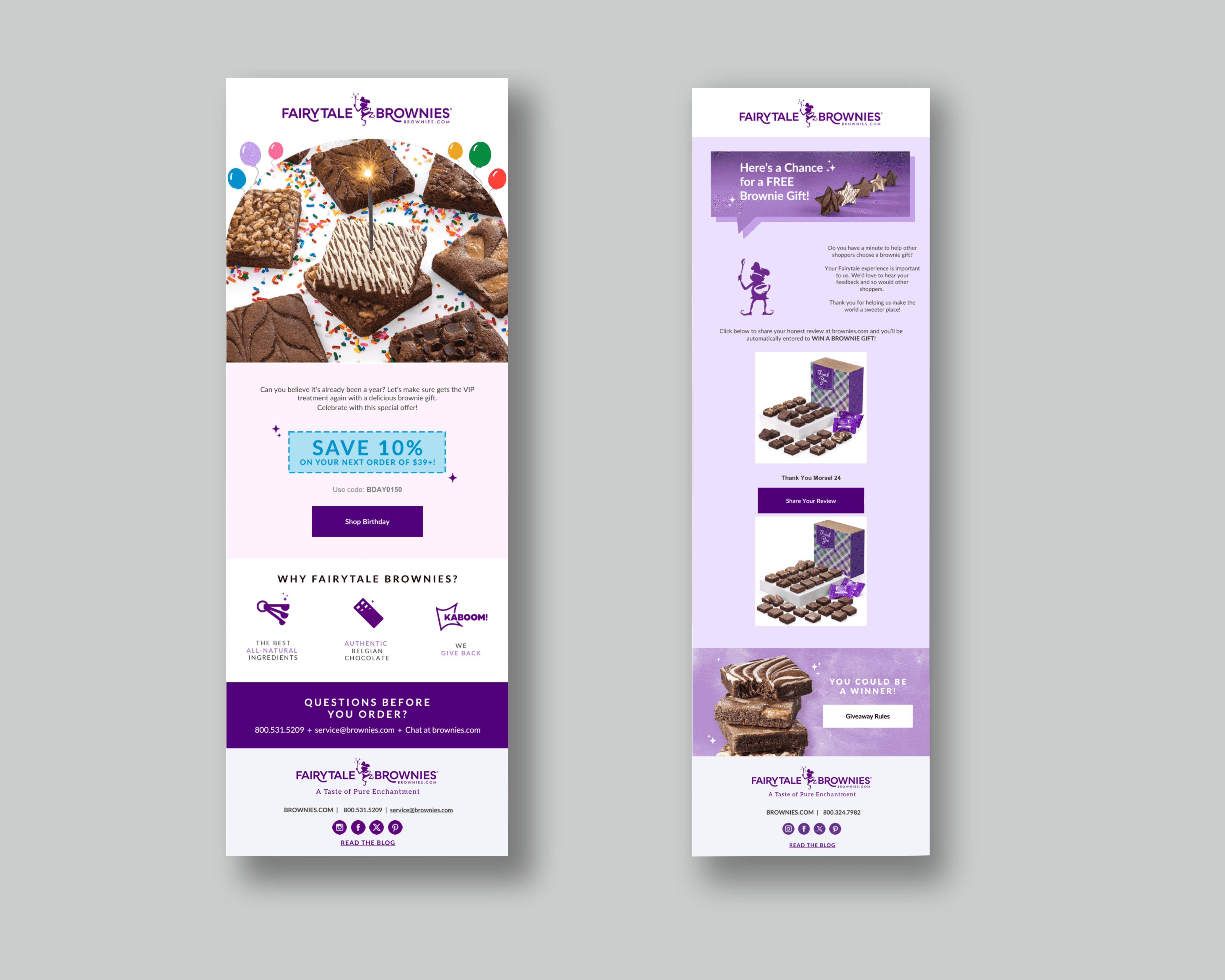The top images showcase a couple of automated emails I designed. The first one is called the "Birthday Recipient email" and it is meant to encourage the customer to buy a gift. My goal was to make it more inviting and playful, so I incorporated the balloons to connect it to the birthday packaging.