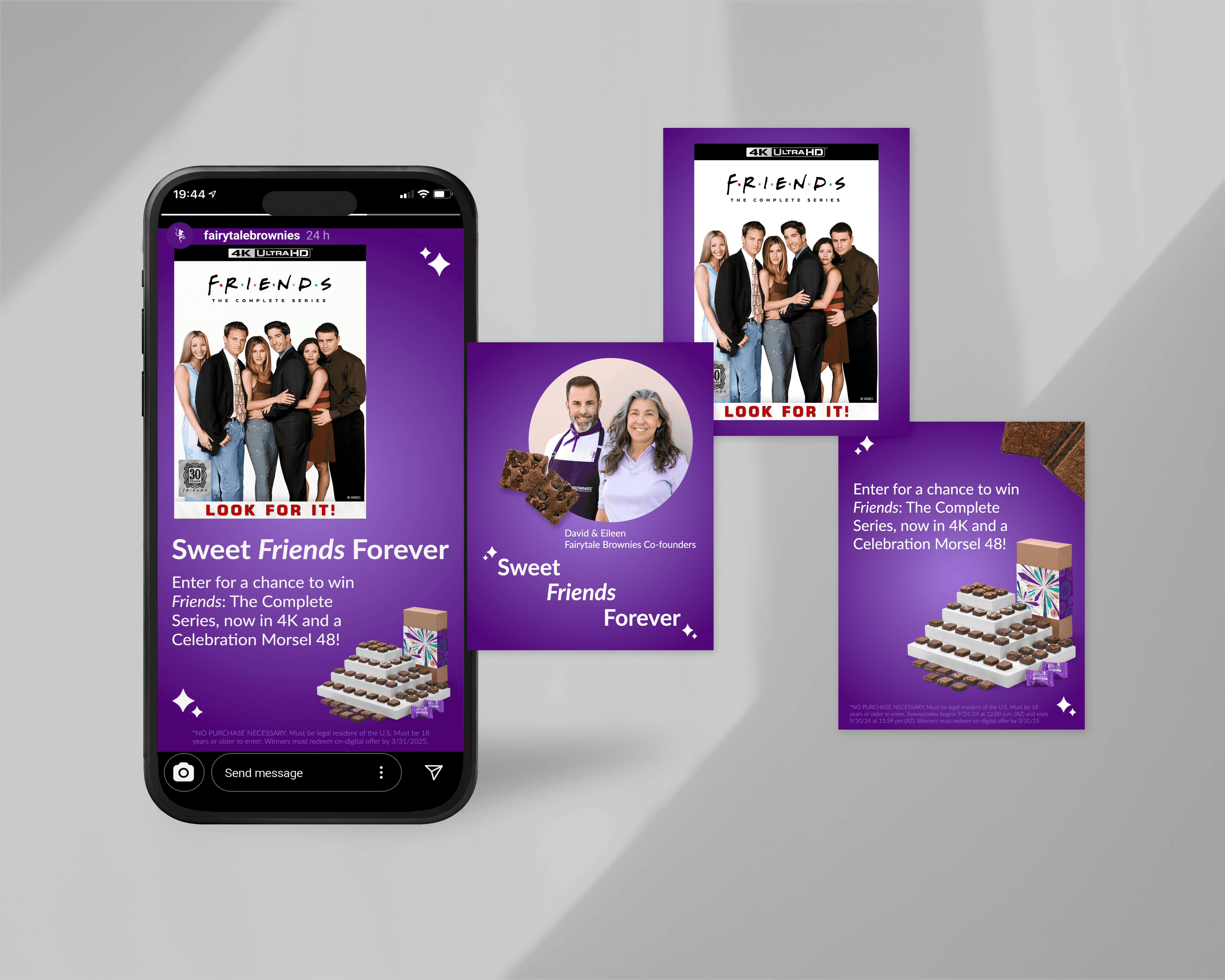 The hero image shows a social post I designed for a collaboration with Warner Bros to promote their new release of Friends. The collaboration was a giveaway for the complete Friends collection and a brownie gift. The giveaway was posted on Warner Bros social pages and on Fairytale Brownies.