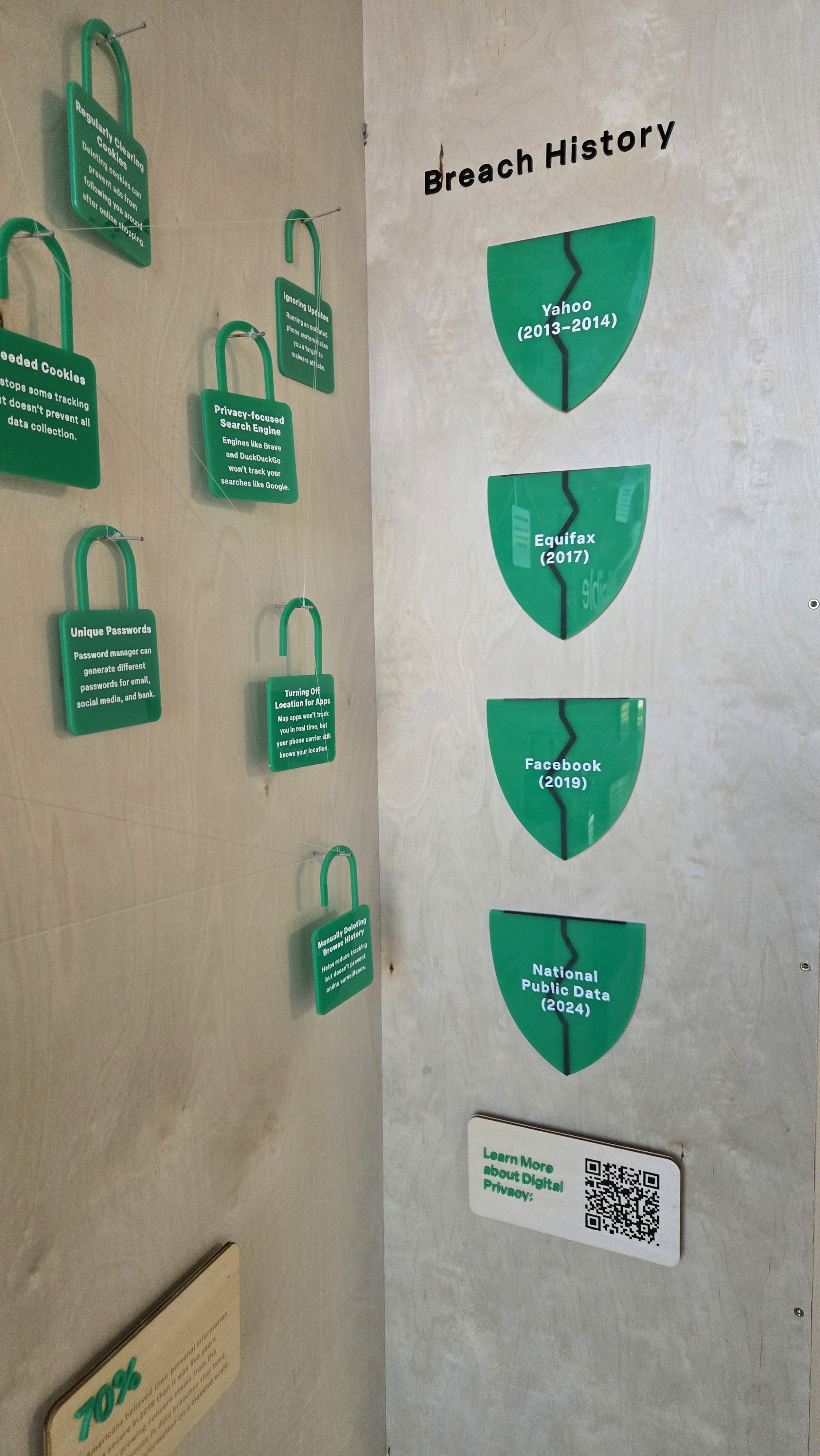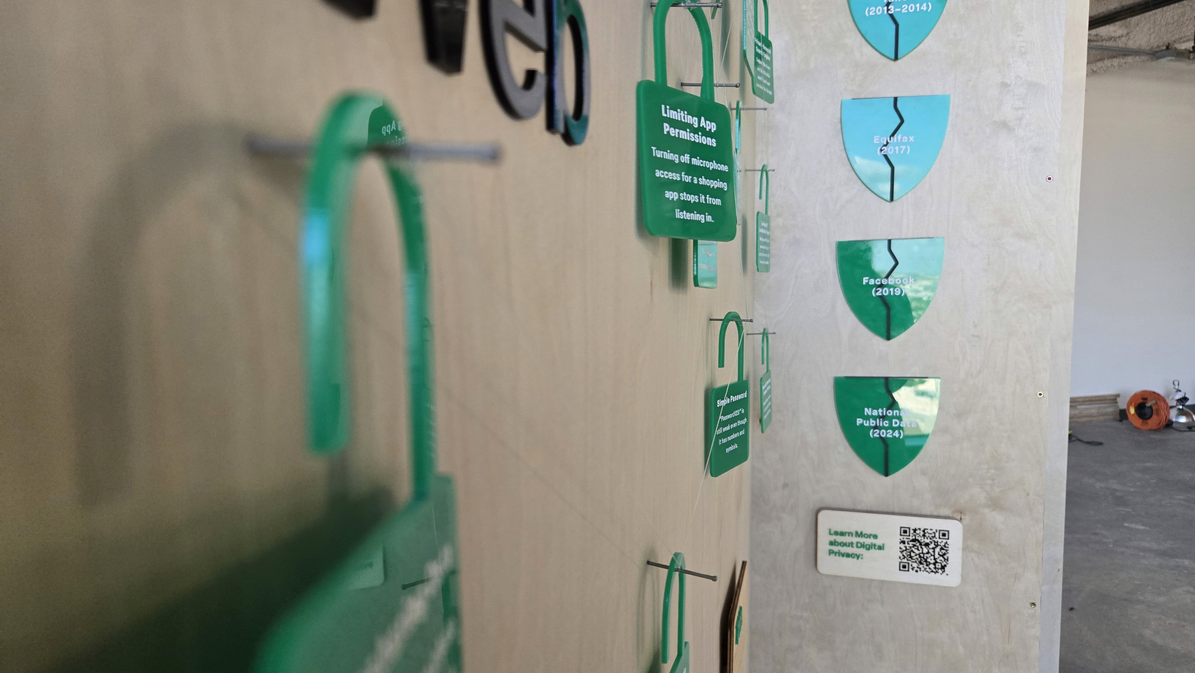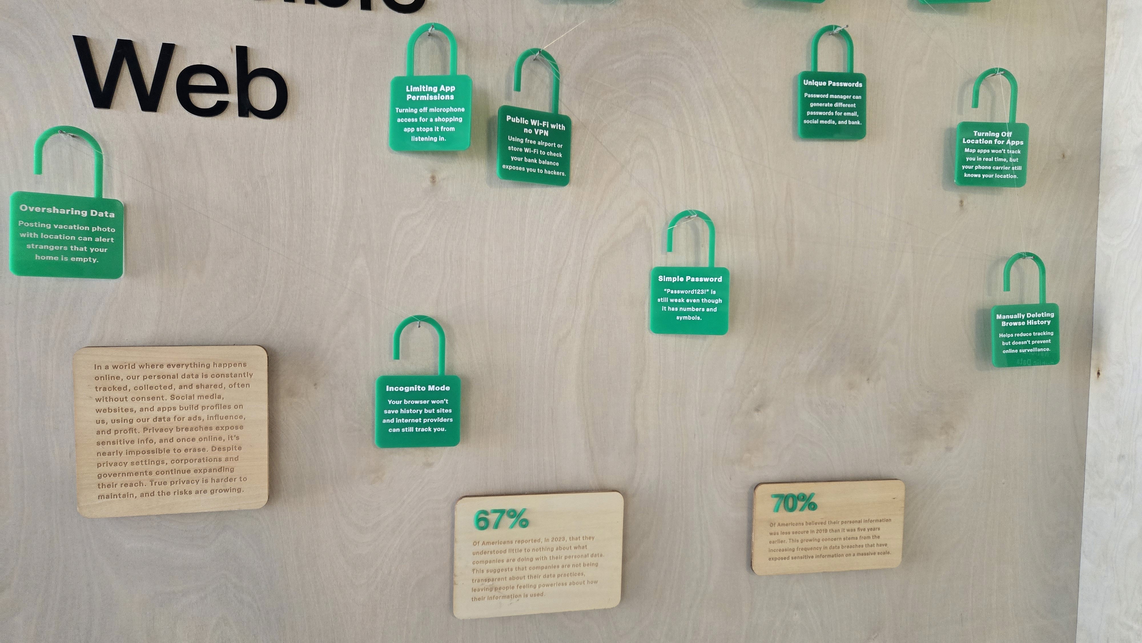 The close-ups show what the exhibit looked like in person. Using acrylic, wood, fishing wire, and finishing nails, the exhibit was quite simple overall. The fishing wire was used to help connect the different "open" locks as it is meant to symbolize that all cracks in the digital space is to lead a breach. I used fishing wire because it isn't always visible. Depending on the angle it's seen, the wire becomes invisible. It helps show that even though we don't see it, all the small choices we make online, can lead to our information being stolen.