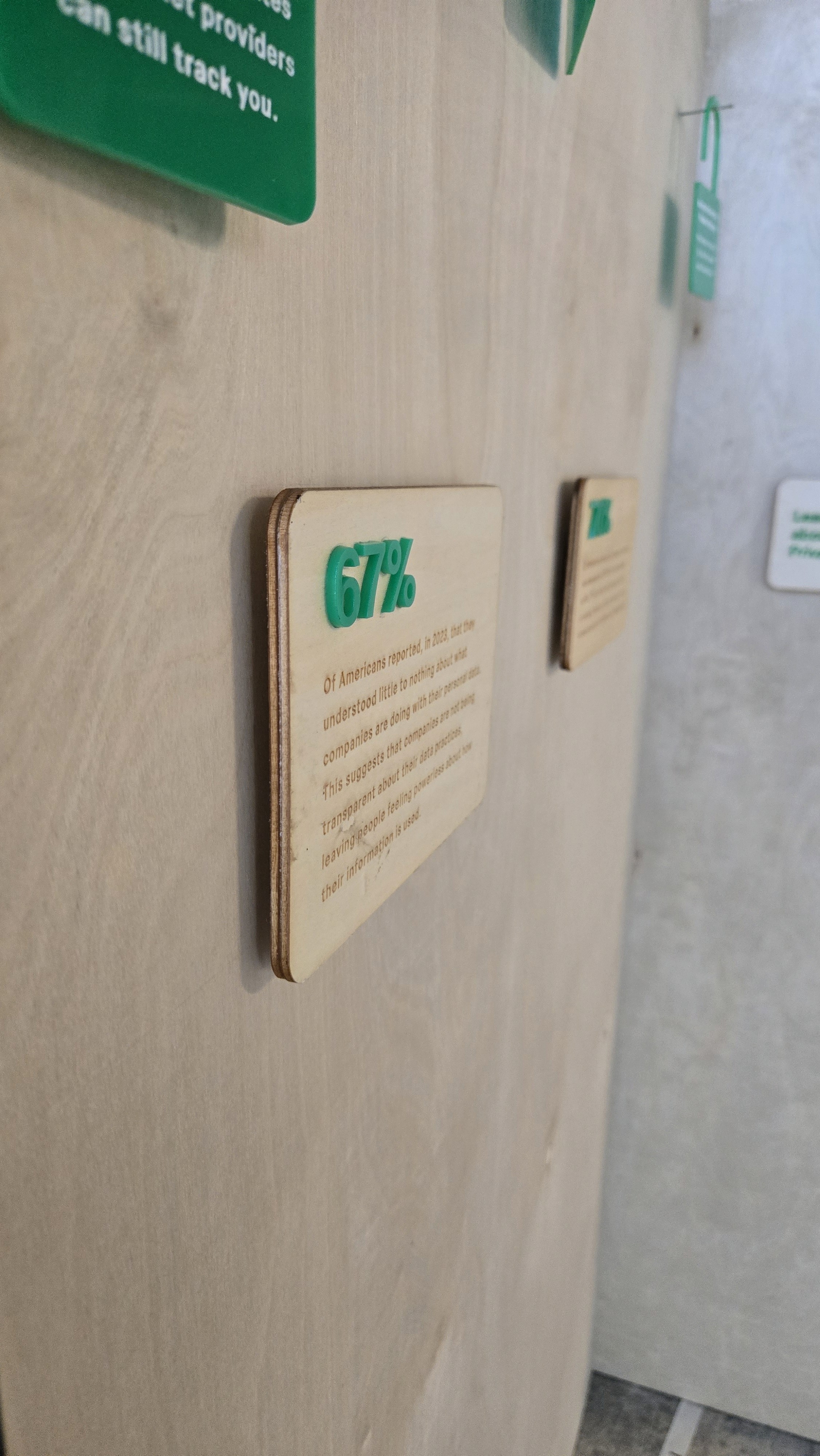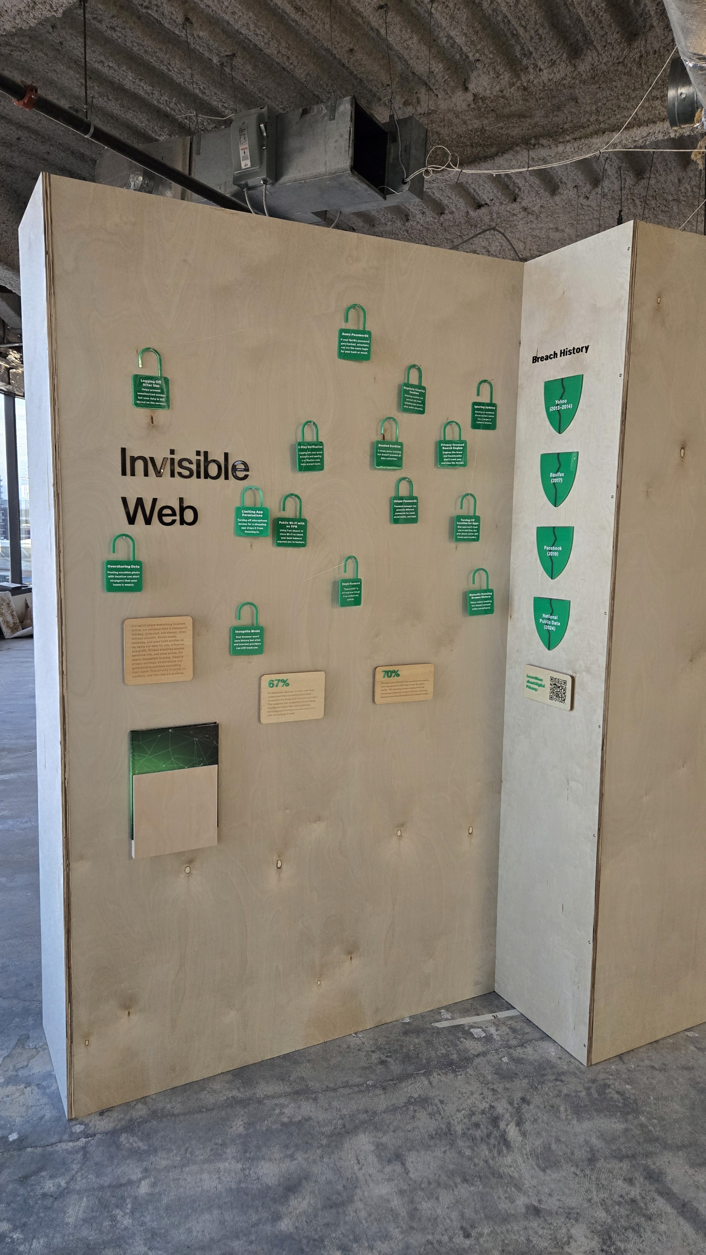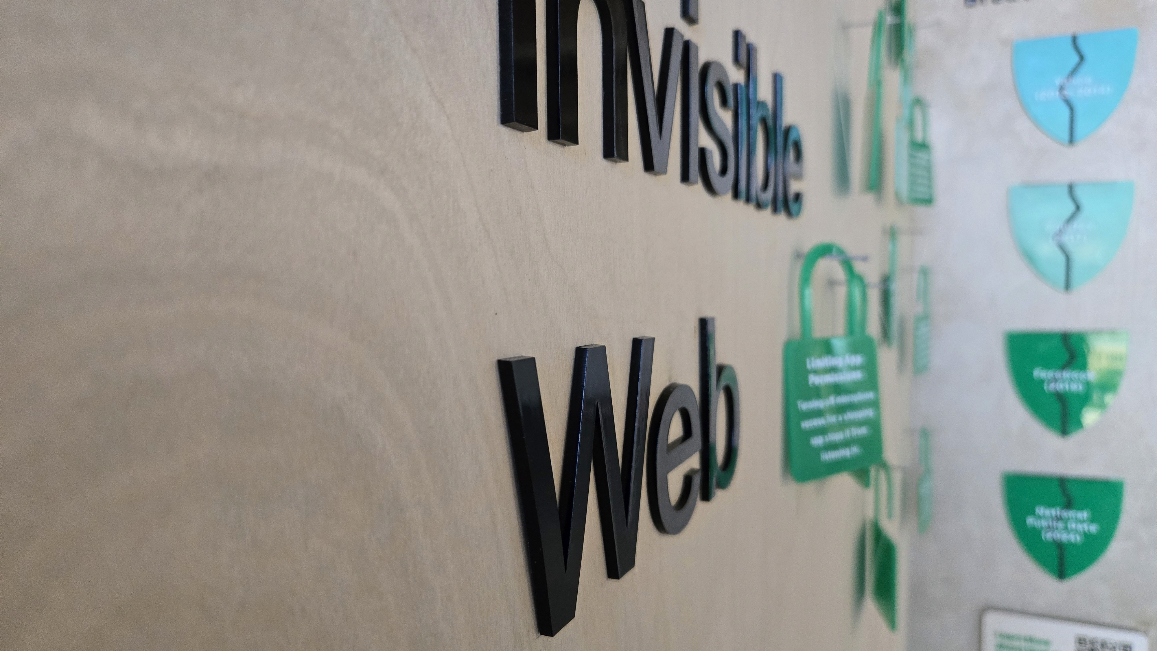 The close-ups show what the exhibit looked like in person. Using acrylic, wood, fishing wire, and finishing nails, the exhibit was quite simple overall. The fishing wire was used to help connect the different "open" locks as it is meant to symbolize that all cracks in the digital space is to lead a breach. I used fishing wire because it isn't always visible. Depending on the angle it's seen, the wire becomes invisible. It helps show that even though we don't see it, all the small choices we make online, can lead to our information being stolen.